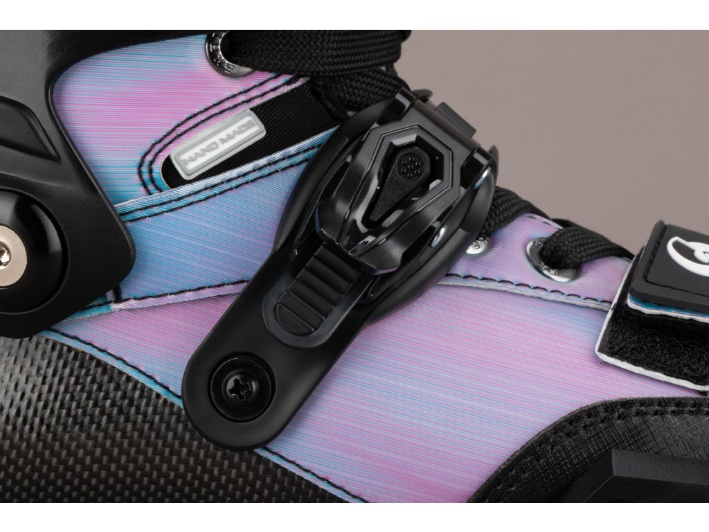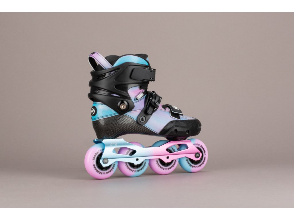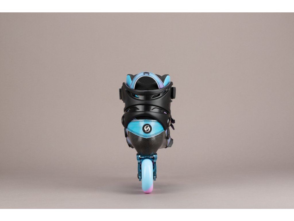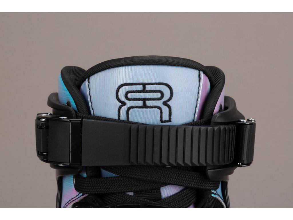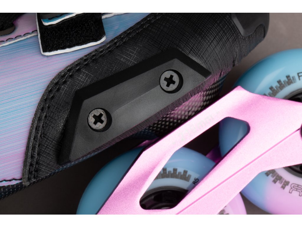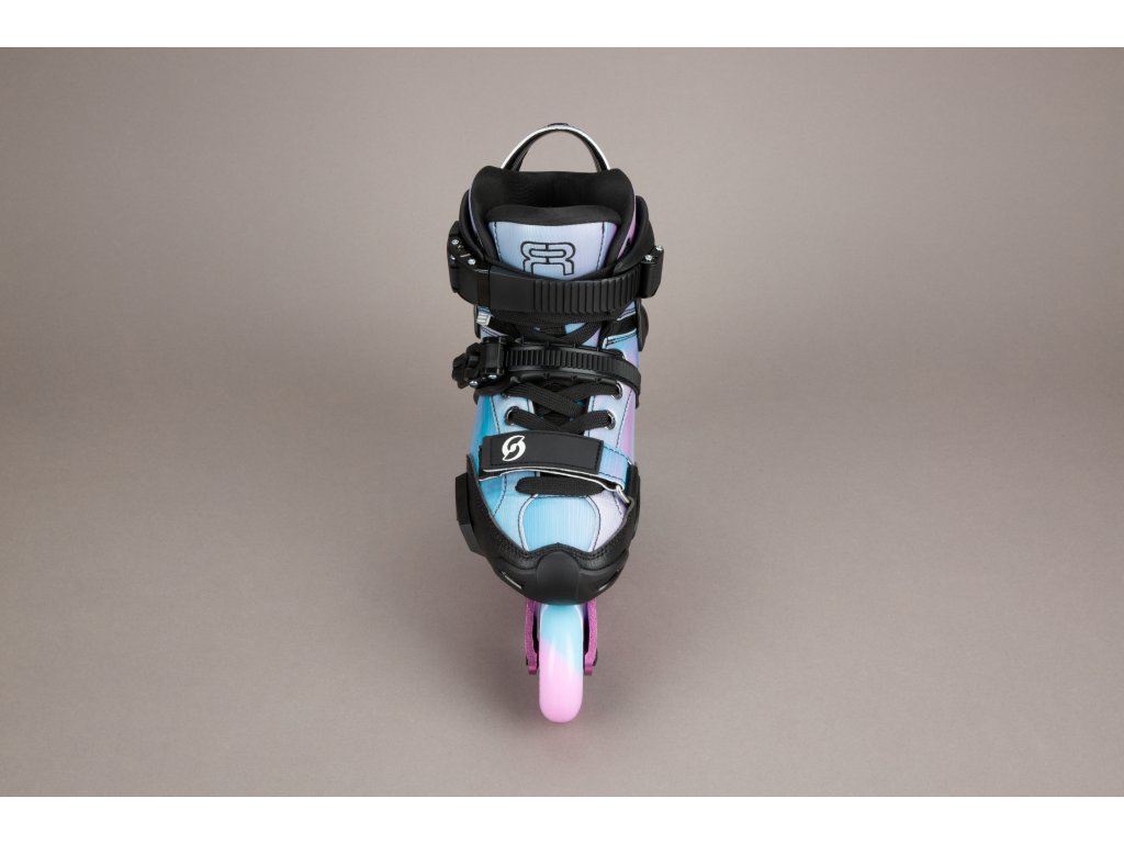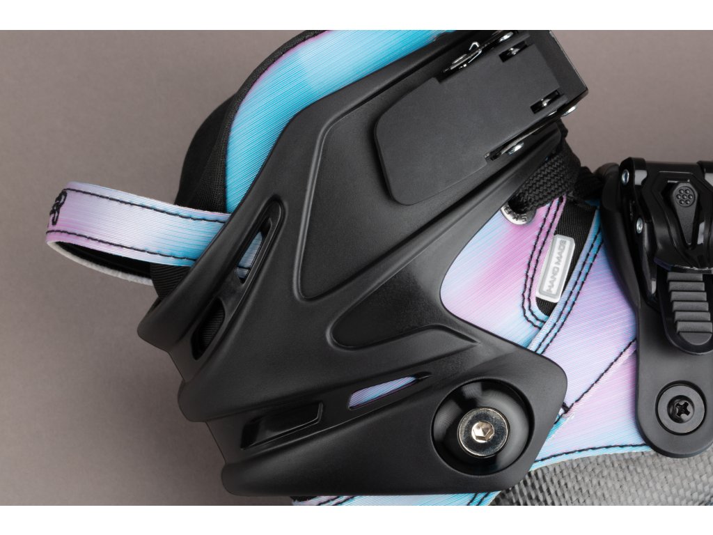 Iridescentní povrch HOLO Blue / Pink dává modelu SPIN JI jedinečný vzhled. Díky živým, barevně se měnícím tónům si tyto brusle zamilují děti, které chtějí na skate spotu zářit a být vidět.